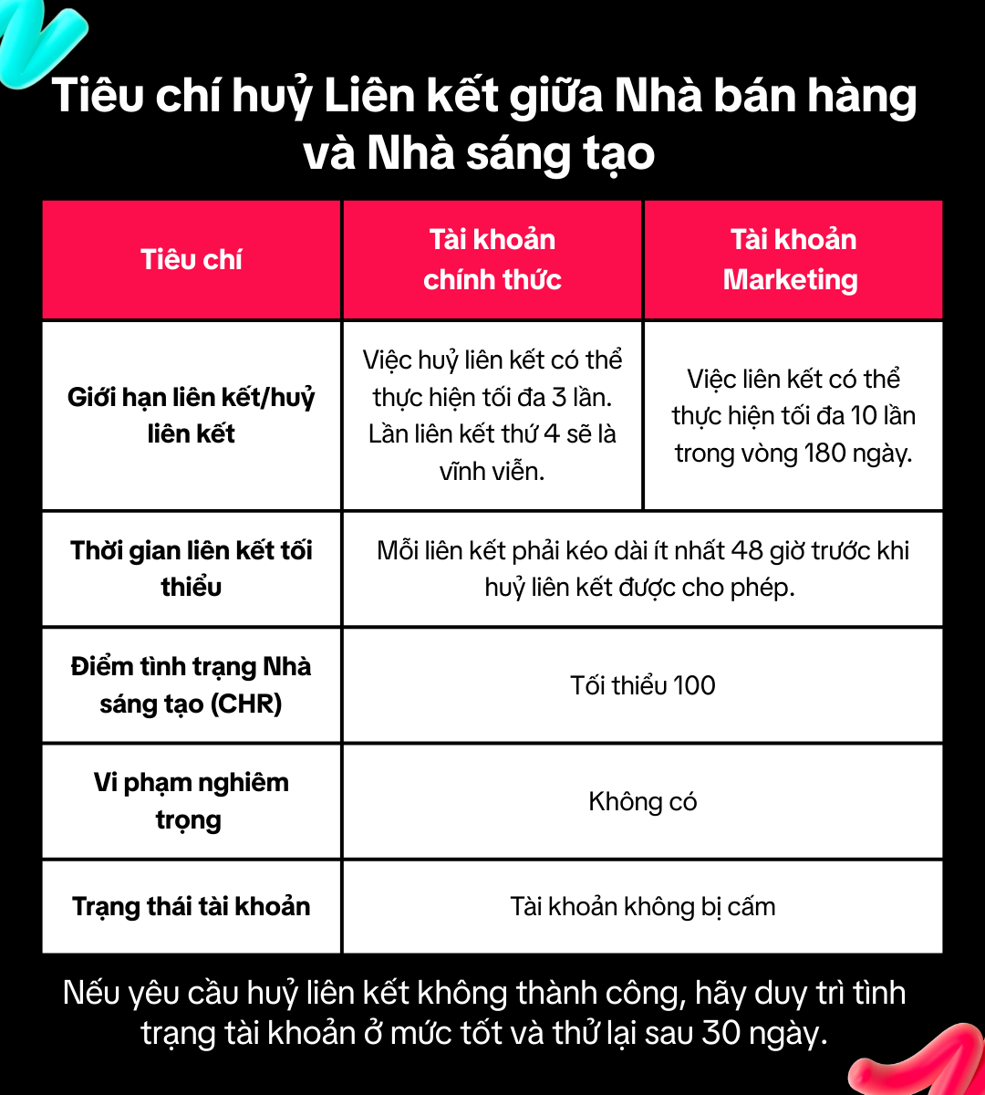 TikTok Shop quy định mỗi liên kết phải được duy trì tối thiểu 48 giờ trước khi có thể gửi yêu cầu hủy. Quy định này nhằm tránh việc thiết lập liên kết ngắn hạn không hiệu quả hoặc thao tác liên kết mang tính thử nghiệm gây ảnh hưởng đến hệ thống.